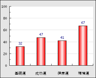 環境運 家庭や職場等での援助運・環境運を司ります。これが良いと配偶者や子供・職場の同僚などから助力が得られやすく、悪いと波乱・不和・孤独などがあります。 67点