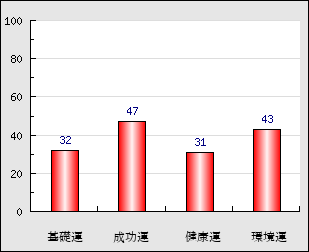 成功運 目的に対する成功運の強さをあらわします。この点数が高いほど自分の思い通りに成功し、逆に悪いと逆境・批判・障害などに苦心します。 47点