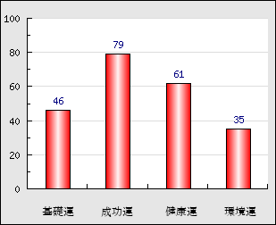 成功運 目的に対する成功運の強さをあらわします。この点数が高いほど自分の思い通りに成功し、逆に悪いと逆境・批判・障害などに苦心します。 79点