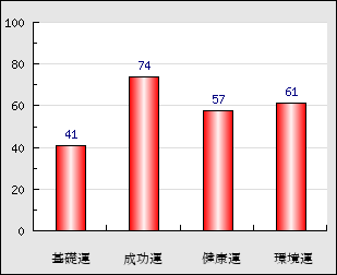 成功運 目的に対する成功運の強さをあらわします。この点数が高いほど自分の思い通りに成功し、逆に悪いと逆境・批判・障害などに苦心します。 74点