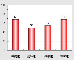 成功運 目的に対する成功運の強さをあらわします。この点数が高いほど自分の思い通りに成功し、逆に悪いと逆境・批判・障害などに苦心します。 50点