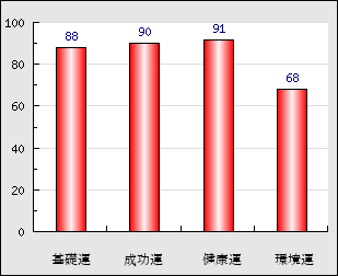 環境運 家庭や職場等での援助運・環境運を司ります。これが良いと配偶者や子供・職場の同僚などから助力が得られやすく、悪いと波乱・不和・孤独などがあります。 68点